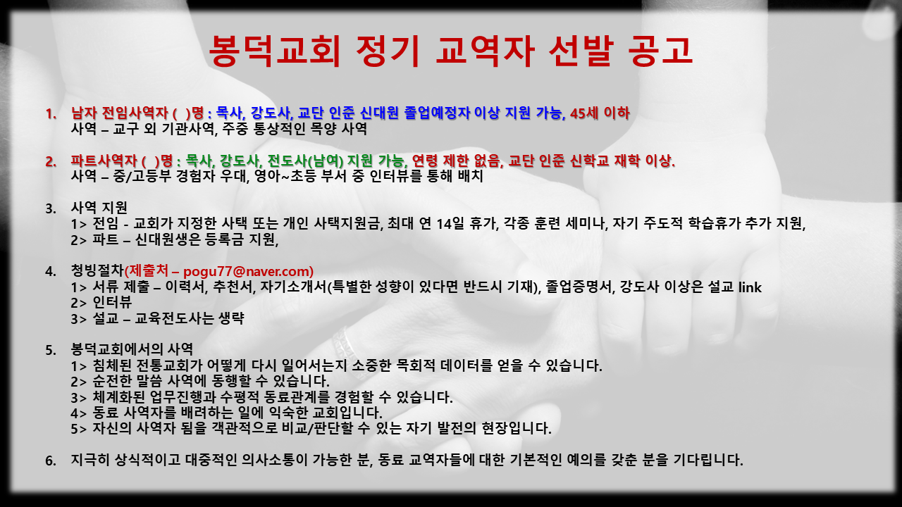2025년 봉덕교회 정기 전임/파트 사역자 청빙 공고