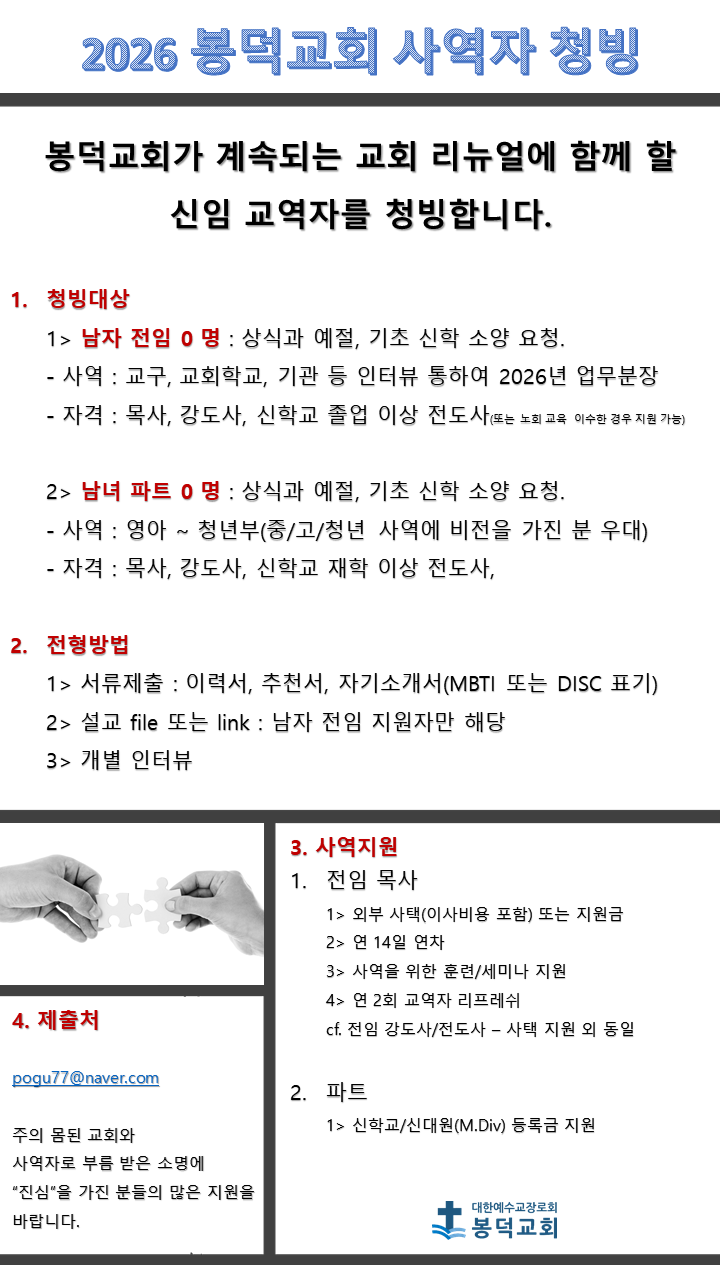2026년 봉덕교회 정기 전임/파트 사역자 청빙 공고