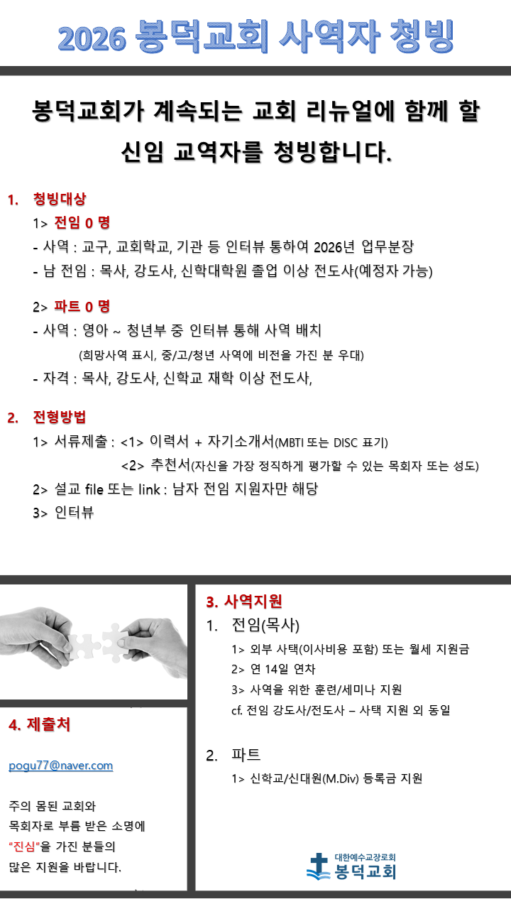 2026년 봉덕교회 정기 전임/파트 사역자 청빙 공고