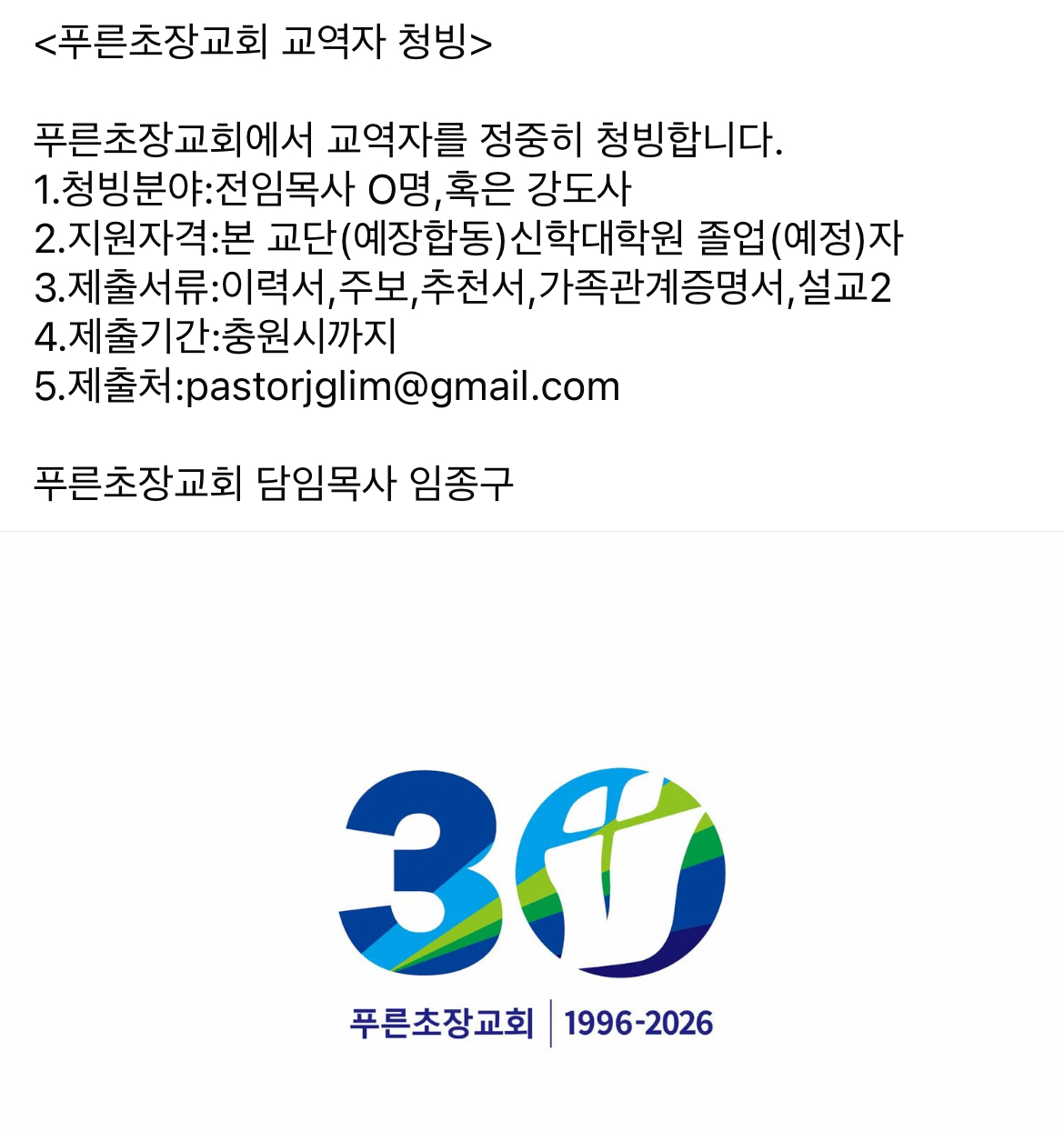 대구 푸른초장교회에서 교역자를 정중히 청빙합니다.