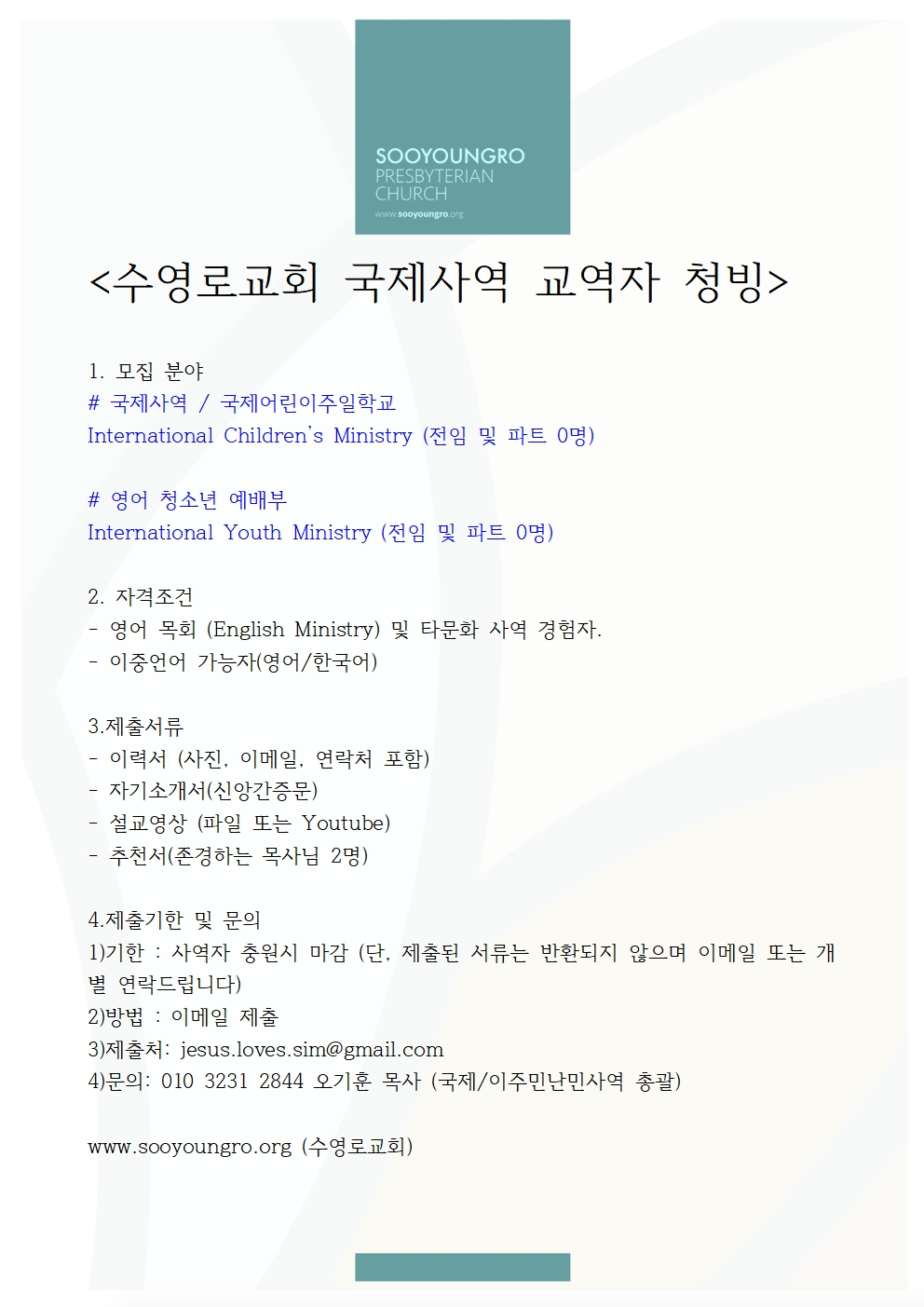 1)기한 : 사역자 충원시 마감 (단, 제출된 서류는 반환되지 않으며 이메일 또는 개별 연락드립니다)