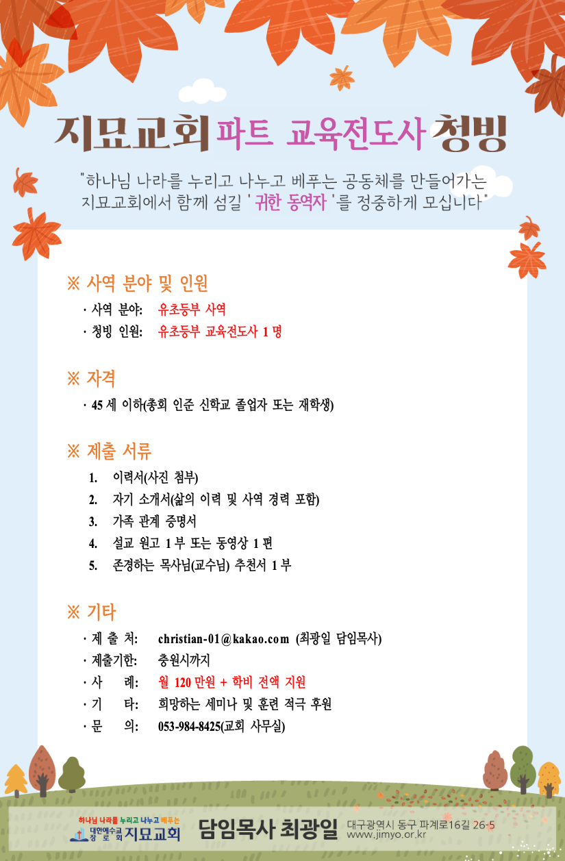 지묘교회에서 사역자를 초빙합니다.