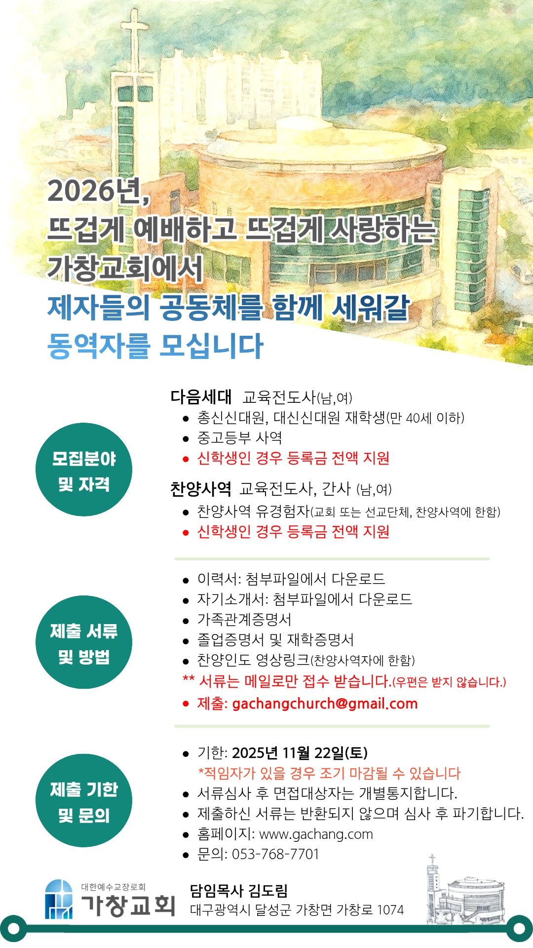 (끌어올림) 대구가창교회에서 파트사역자를 모십니다.