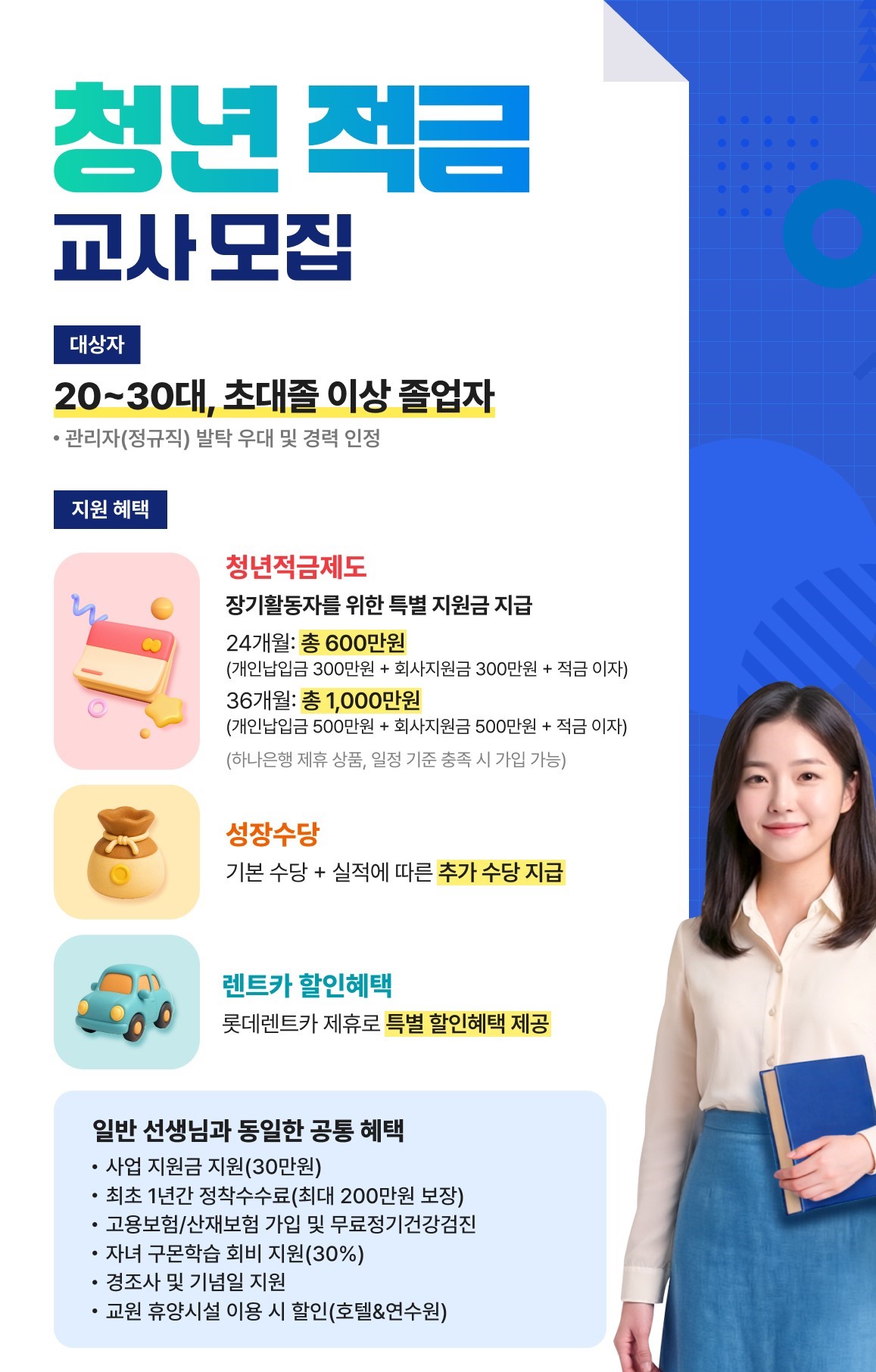 업무 : 주 1회 구몬회원 가정을 방문하여 학습관리 ※한 과목당 10분 지도 개인 능력별 학습교재라 아이 스스로 공부가 가능한 교재입니다. 세밀한 교사 교육으로 지도하기에 전혀 어렵지 않습니다. 시간 : 1. 교육 : 매주 월, 화 or 월, 수 오전 10시~11시 거주지와 가까운 사무실 출근(전국 사무실 350개) 2. 방문 수업 : 평균 오후 3시 ~ 9시 수업이 있는 요일만 / 평균 2~4일 근무 전형일정: 1. 면접 : 상담 후 결정 2. 입문 교육 : 3일 (비대면 온라인) 3. 실무 교육 : 5일 (오전 9:30 ~ 오후 15:00) 필수조건 ★ 1년 이상 근무가능 하신 분 ★ 대학교 2년제 졸업 이상 (휴학, 중퇴 시 70학점 / 예체능 80학점 이상) 청년적금제도 사진참고 구몬 선생님 문의 : 010-4505-9902 |