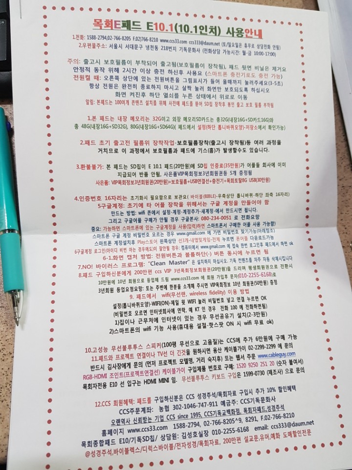 한국교회 목회자들을 위한 정보와 자료를 제공하는 CCS 한국기독종합백화점의 강단설교전용 목회종합패드 E10.1 이 목회자들의 크나큰 호응을 얻고 있다. 10.1인치 큰화면의 최신 PAD(태블릿PC)에 목회기능이 장착된 SD메모리 카드칩을 장착 WIFI 없는 섬이나 해외선교지, 기도원이나 지하실에서도 사용이 가능하여 큰 인기를 끌고 있다. 목회자들의 목회사역에 도움을 주는 목회비서 역할을 하는 목회종합패드 E10.1 은 10인치 큰화면에 설교노트기능까지 갖고 있어 강단용이나 국내외 출장시 목회실을 대신하는 역할을 할수 있게 설계 되었다. 올해로 23년을 맞이하는 오래된 역사의 CCS에서 10여년간 목회종합 PAD를 공급하여 왔는데 2018 년 들어 최신 10.1인치 PAD에 100가지 목회기능을 새롭게 장착하면서 목회비서로서의 역할을 하고 있다. 목회종합패드NEW E10.1 에는 다양한 종류의 목회자료가 들어가 있는데 전자성경, 성경주석, 반주기, 오디오찬송가, 오디오복음성가, NIV영어성경 및 영어주석, 성경사전, 성구사전, 성경지도, 주제별성경구절, 설교문,예화,유머,심방설교,성경지도,한국교회설교방송,영어일본어중국어학습기와 통번역기는 물론 070전화기능까지 사용 가능하도록 제작되었다. 전자성경은 기존의 전자성경과 달리 개역한글과 개역개정 모두 듣거나 볼수 있고 글자크기 조절은 물론 이어읽기와 즐겨찾기 기능을 갖고 있을 뿐만 아니라 정독/속독 구분 듣기와 보기가 가능하며 글자색이나 배경색 또한 조절이 가능하다. 특히 전자성경을 듣고 보다가 관련 관주구절을 클릭하면 즉시 관주성경구절을 뛰워 주어 목회자들이 시간을 효과적으로 이용하도록 배려하였다. 그리고 성경을 읽다가 관련구절을 체크하여 설교노트로 이동 설교문서 작성이나 수정편집 인쇄기능까지 갖추어 강단에서도 설교 원고지 대신에 직접 사용하기 편하게 했다. 또한 성구사전은 특정주제나 키워드 입력시 즉시 구절을 뛰워 주며 또한 AND 기능이 있어서 두단어가 들어간 구절까지 신구약에서 모두 찾아주며 특정 성경장(예를 들어 창세기, 요한복음)에서만 관련 단어를 찾는 기능에 찾은 구절을 클릭하면 듣기기능도 있어서 성구사전 찾기에는 획기적인 것으로 평가받고 있다. 이러한 성구사전을 NIV영어로도 찾을수 있어 획기적이라 평가받고 있다. 또한 NIV영어성경도 오디오 성경으로 들을수 있는데 NIV영어성경이 한국어와 대조로 성경이 보여주게 나와 영어공부에도 편리하고 특히 눈길을 끄는 것은 영어성경을 듣고 보다가 모르는 영어단어를 더불클릭시 영어사전을 뛰어주어 영어성경 관심자들에게 폭발적인 반응을 얻고 있다. ? 영어회화나 영어단어는 물론 영어성경주석도 칩내에 내장시켜 WIFI 안되는 어디서나 영어주석을 공부할수 있게 하여 wifi가 안되는 지역에서 사역하는 오지나 기도원, 오지 선교사들에게도 좋은 반응을 얻고 있다. 또한 찬송가 650여곡 전곡이 반주기와 오디오 찬송가가 녹음 내장되어 개척교회나 일반교회 반주기 대용으로도 많이 사용되고 있다. 복음성가 음원도 내장되어 목회준비를 하다가 복음성가를 들을수도 있게 하였다. 화질이 HD라 고화질이고 밧데리 용량이 오래가며 내장 스피커 용량이 커 심방예배나 야외예배용으로도 최적의 목회도구라 할수 있다. WIFI 없이 약 50개국어로 번역이 가능하도록 번역기가 칩내에 내장되어 있고 070 전화기로도 사용할수 있다. 또한 성경지도도 모든 성경지역에 대해서 볼수 있고 TV나 프로젝트로도 연결될수 있어서 교육용으로도 좋고 그림노트에 쓰기 기능이 있어서 터치펜으로 강의를 하여 화면에서 보여주는 기능도 있어 목회자는 물론 신학대학교수들이나 교육훈련 전문 사역자들에게도 유용한 도구이다. 뿐만아니라 목회종합패드 NEW C10.1 구입고객은 국내1위 5만명이 이용중인 120만편 목회정보를 인터넷으로 실시간 이용 할수 있고 PAD 에도 wifi 없이 사용 가능한 설교/예화/유머등 50만편의 설교강해자료 및 성경주석이 내장되어 있어서 어디서나 쉽게 설교문을 작성하거나 주석을 참조 강해자료를 준비할수 있도록 하였다. 그리고 영어/일본어/중국어/한국어/히브리어/헬라어성경등 약 30개 국어 성경의 특정 구절을 비교해서 볼수 있는 멀티다중 성경도 목회자들이 애용하는 목회도구이다. 이상우 010-7394-8291