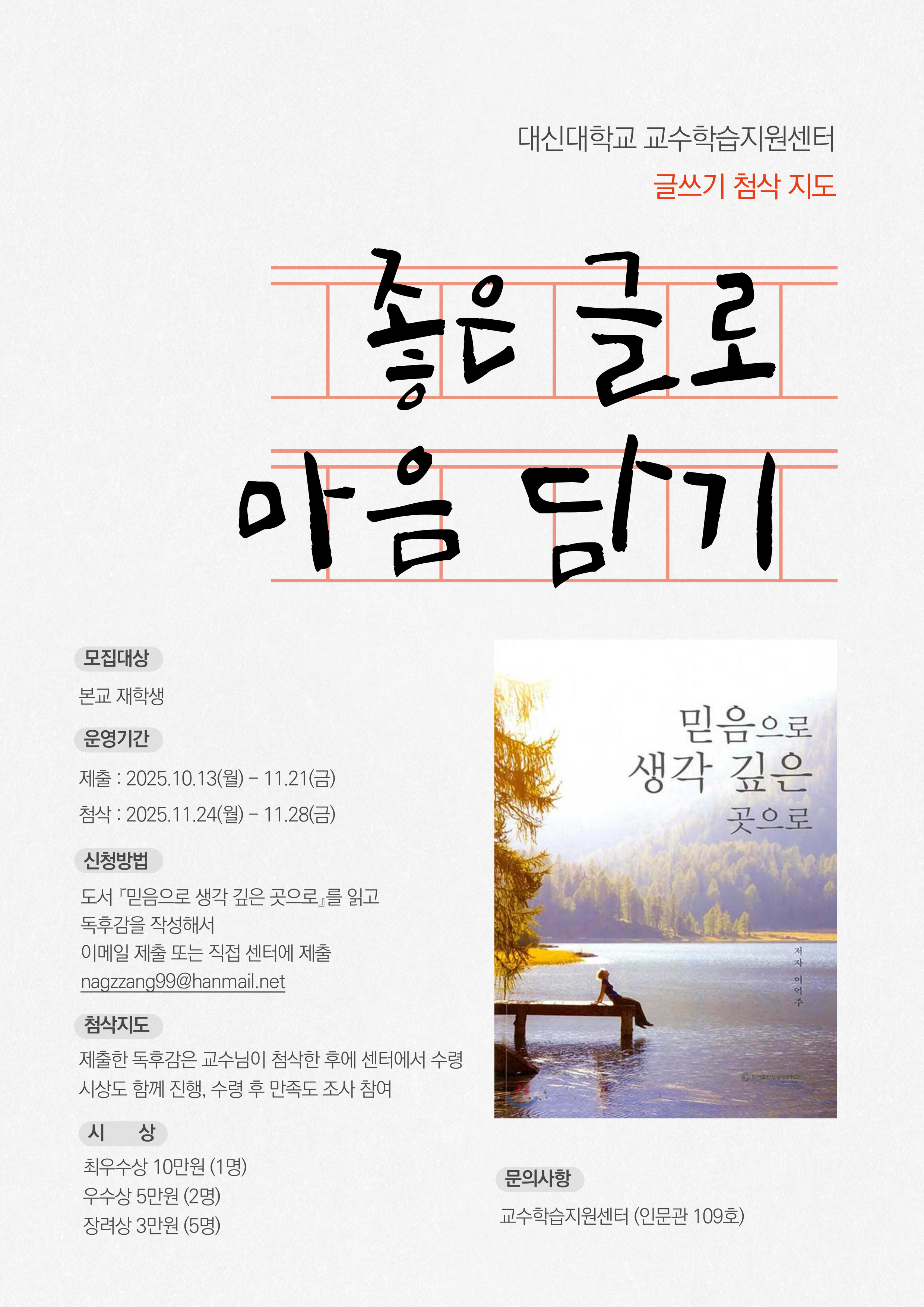 라. 첨삭내용: - 글 전체적인 짜임새와 균형 - 문장의 간결성과 명확성 - 글의 구성 및 내용의 논리성 마. 참가신청 1) 신청 기간: 2025. 10. 13. (월) ~ 11. 21. (금)까지 수시신청 2) 신청 방법: 교수학습지원센터(인문관 109호) 직접 제출 또는 이메일(nagzzang99@hanmail.net) 김도연 연구교수로 제출