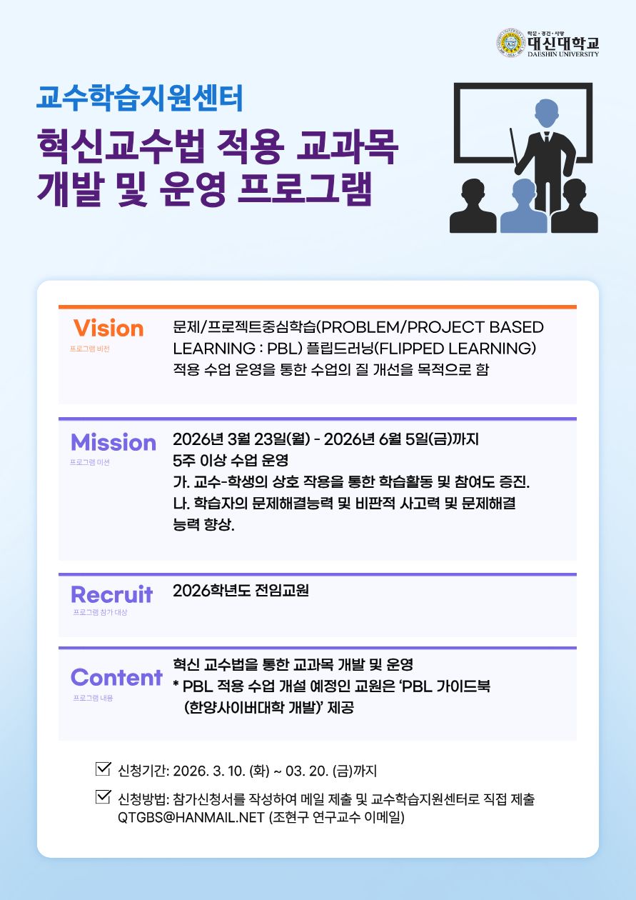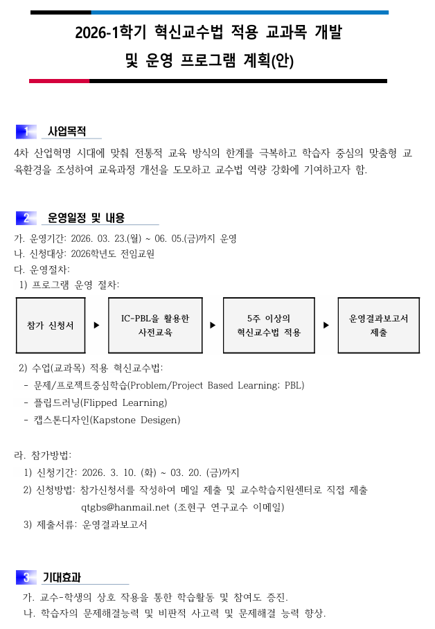 | 2026-1학기 혁신교수법 적용 교과목 개발 및 운영 프로그램 | |||||||||