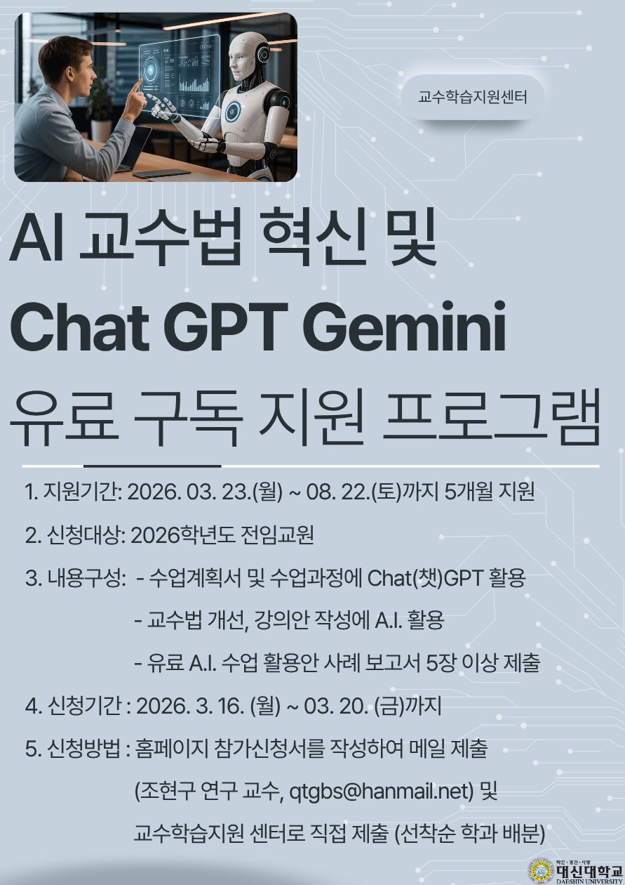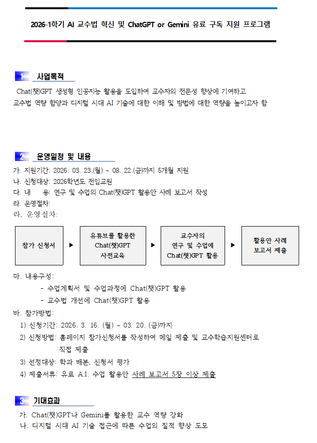 | 2026-1학기 AI 교수법 혁신 및 ChatGPT or Gemini 유료 구독 지원 프로그램 | |||||||||