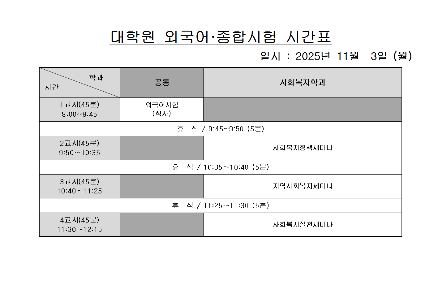 ■ 외국어시험 1. 일시 : 2025년 10월 31일(금) 9:00 ~ 9:45 (석·박사과정) (추가) 2025년 11월 3일(월) 9:00 ~ 9:45 (석사과정) 2. 장소 : 본관407호 ■ 종합시험 1. 일시 : 2025년 10월 31일(금) 9:50 ~ 12:15 (석사과정) 9:50 ~ 13:05 (박사과정) (추가) 2025년 11월 3일(월) 9:50 ~ 12:15 (석사과정) 2. 장소 : 본관407호 ※필기구와 신분증(학생증)을 필히 지참하시기 바랍니다. ※기타 변경사항은 개별문자 발송예정입니다.