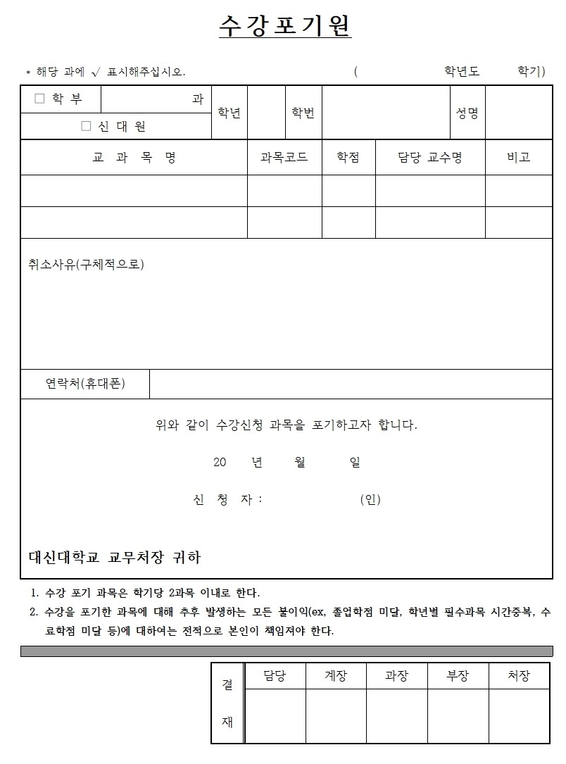 ■ 2026년도 1학기 수강포기신청 안내(학부, 신대원) 1. 신청기간 : 2026년 3월 30일(월) - 4월 4일(토) 2. 신청방법 : 홈페이지에서 관련 규정 및 유의사항을 확인하시고 수강포기원을 작성 후 기간내에 교무과로 제출 3. 수강포기관련 유의사항