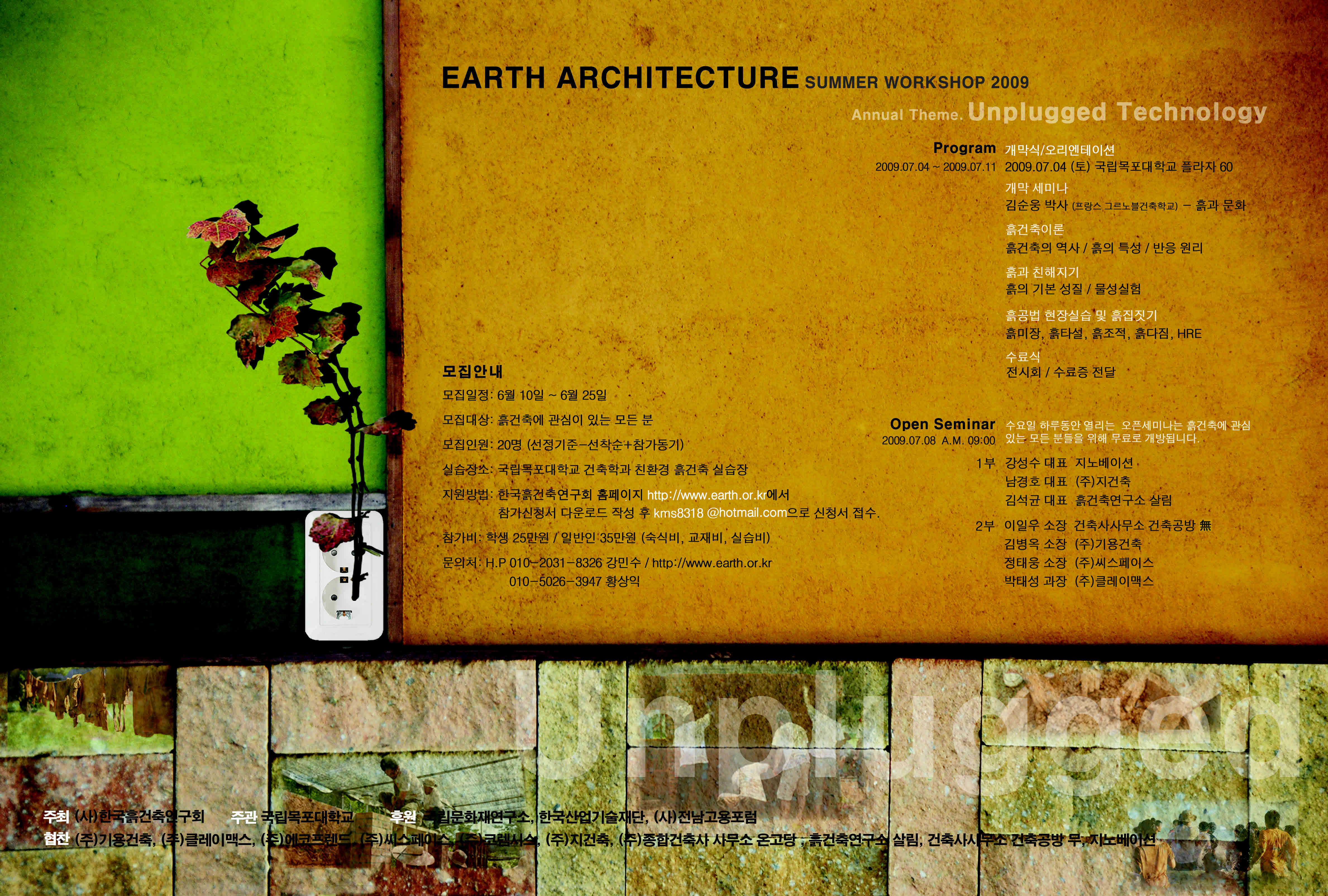 오는 2009년 7월 4일부터 7월 11일 까지 8일간 목포대학교 건축학과에서 Unplugged Technology 라는 주제로 2009 흙건축 워크샵을 개최합니다. 전기를 사용하지 않고 집을 지어보자는 이전 워크샵 참가자들의 의견을 수렴하여 2009년에는 인력으로만 모든 실습을 진행해 보려 합니다. 이로서 생태건축을 배울수 있는 계기가 될것이고 실습과 더불어 오픈세미나, 흙건축 이론을 통해 다양한 경험을 하실수 있을것입니다. 많은 참여 부탁드립니다.