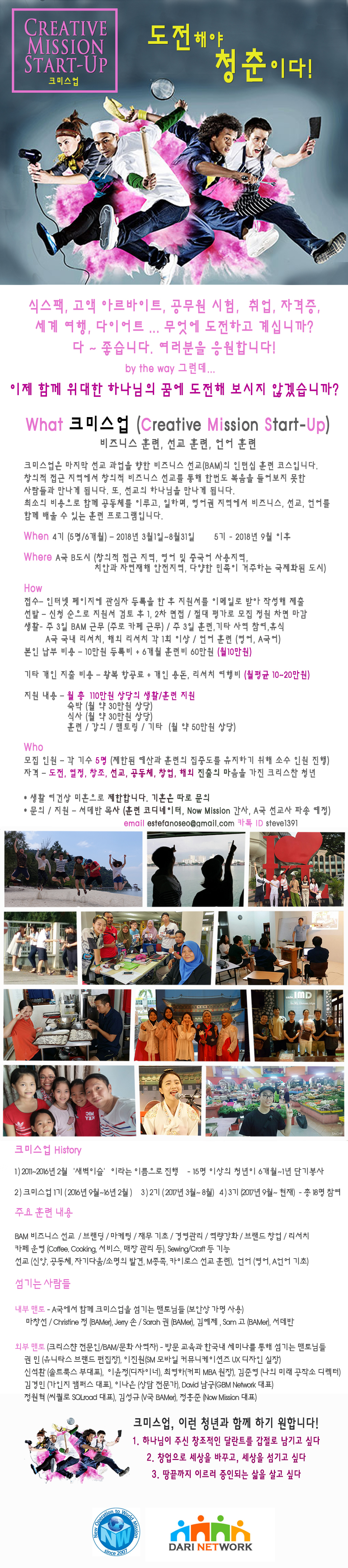 나우미션의 해외인턴십 프로그램 중 하나인 "크미스업(Creative Mission Start-Up)"를 소개하고자 합니다. 크미스업 훈련은 마지막 선교 과업을 향한 비즈니스선교(BAM)의 인턴십 훈련 코스입니다.