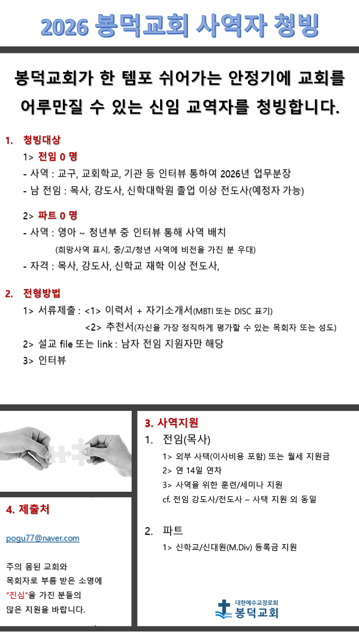 2026년 봉덕교회 정기 전임/파트 사역자 청빙 공고
