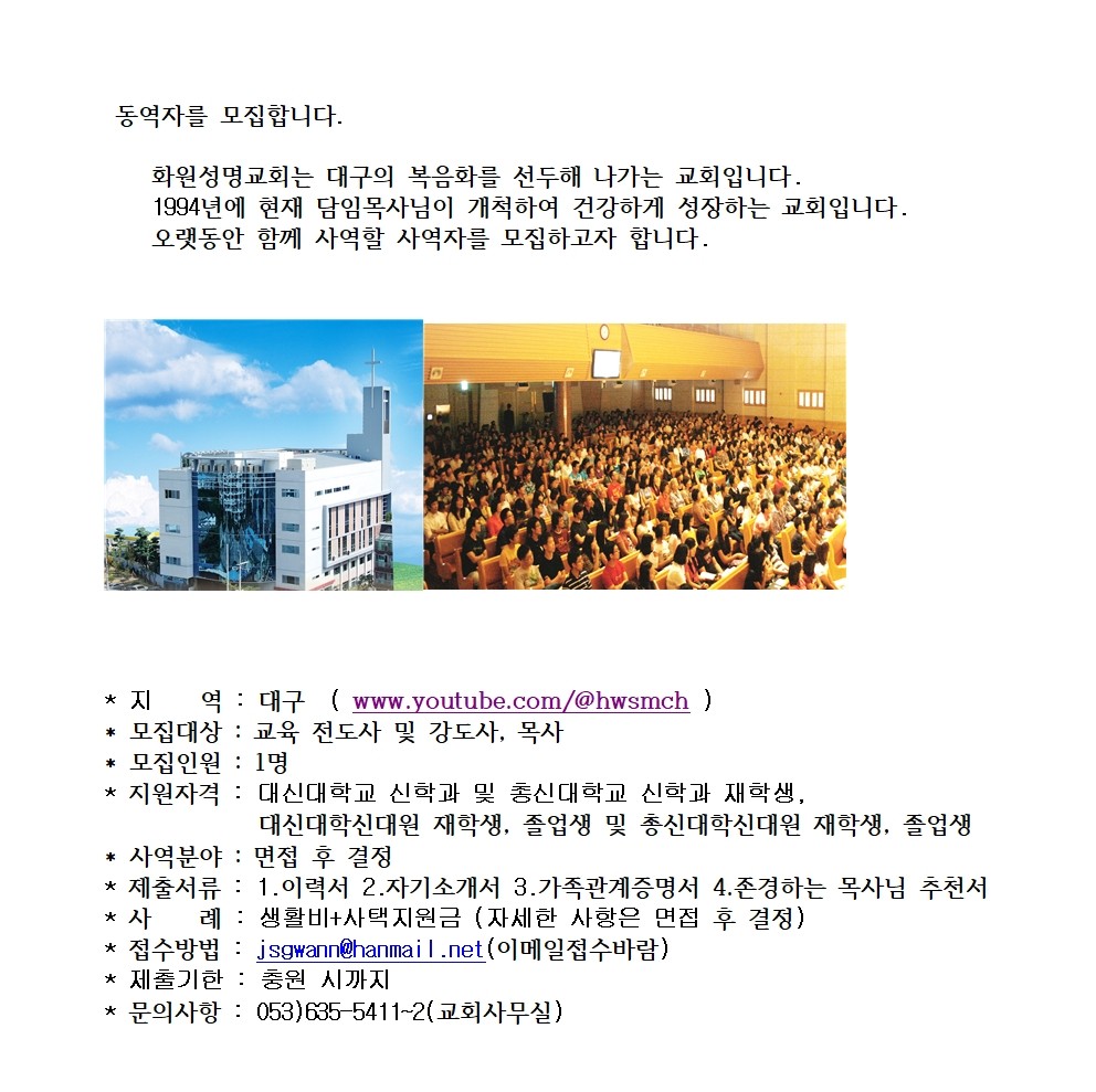 대구 남흥교회에서 함께 할 전임 부목사님을 모십니다.