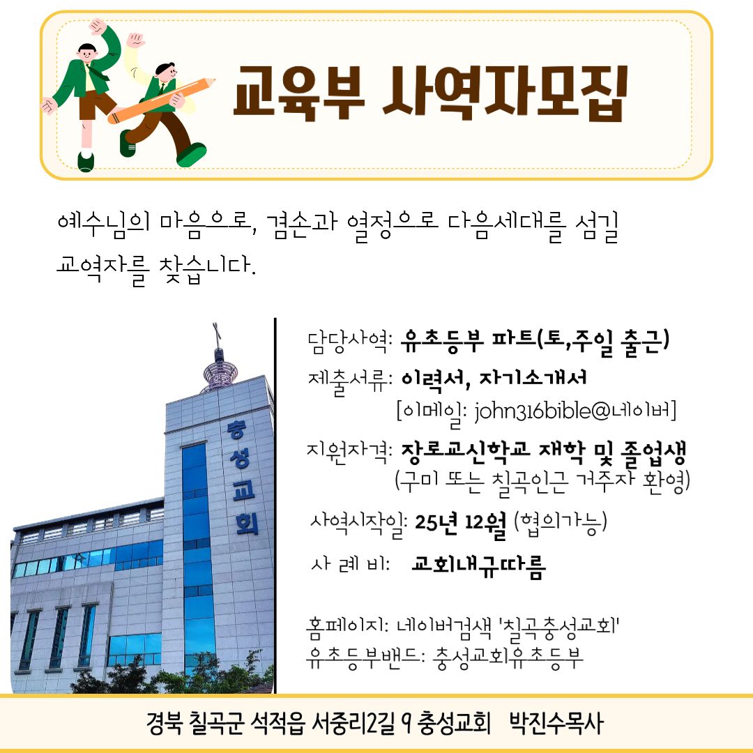 | 칠곡 충성교회에서 교육전도사님(파트)을 모십니다. | |||||||||
